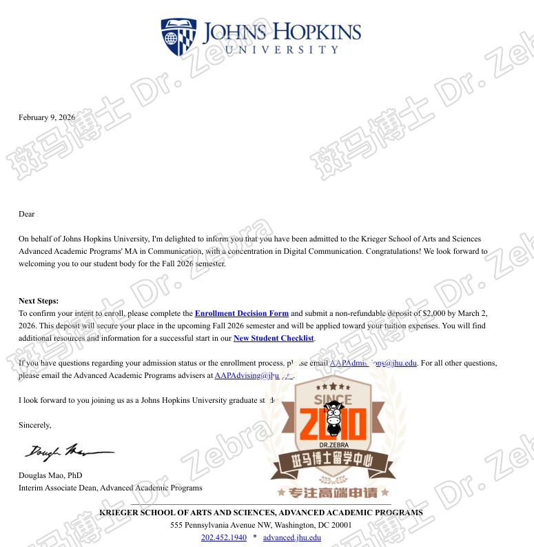 恭喜斑马博士客户获得Jhu MA in Communication硕士录取+5000美元奖学金!