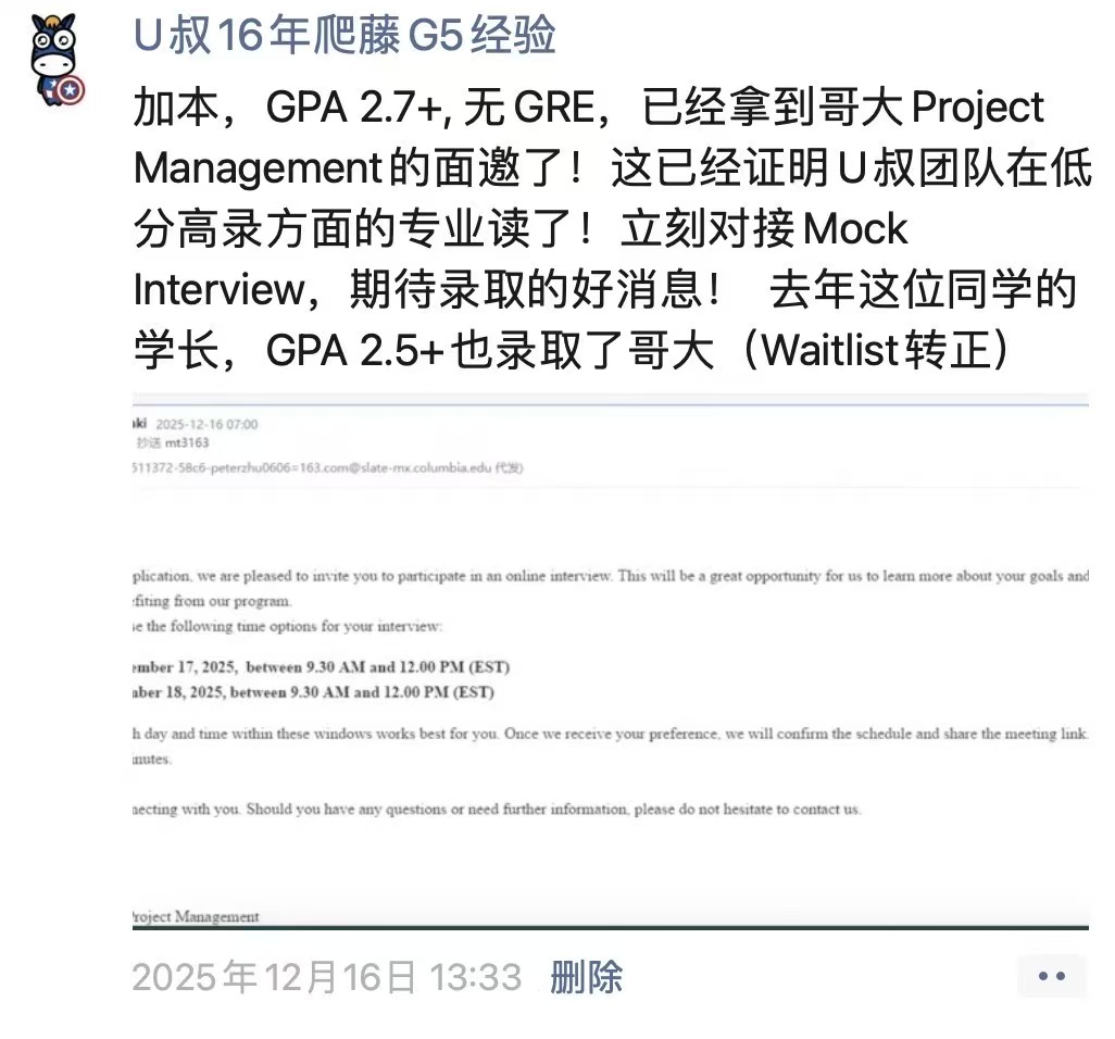 #U叔在12月16号发了一个#加本GPA2.7+#无GRE拿到哥大Project Management的面邀了?#今天U叔这位Mentee拿到Offer啦~