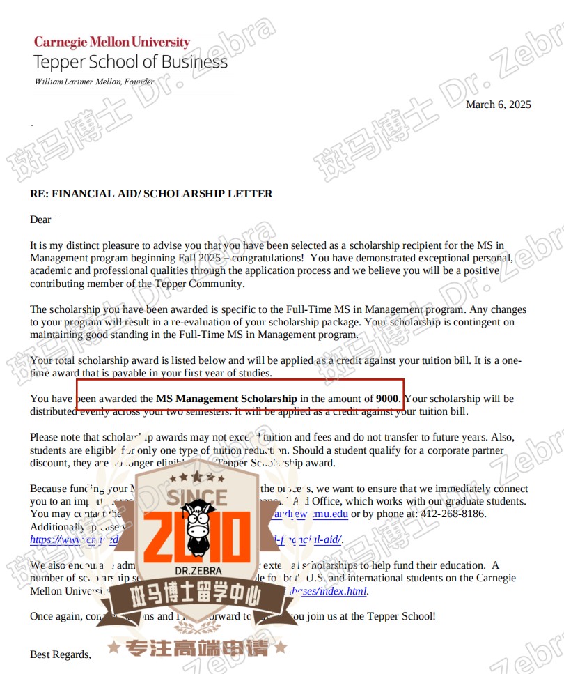 恭喜斑马博士客户获得卡耐基梅隆大学Carnegie Mellon University(CMU)Master of Science in Management(MSM)管理硕士录取+9000美元奖学金!
