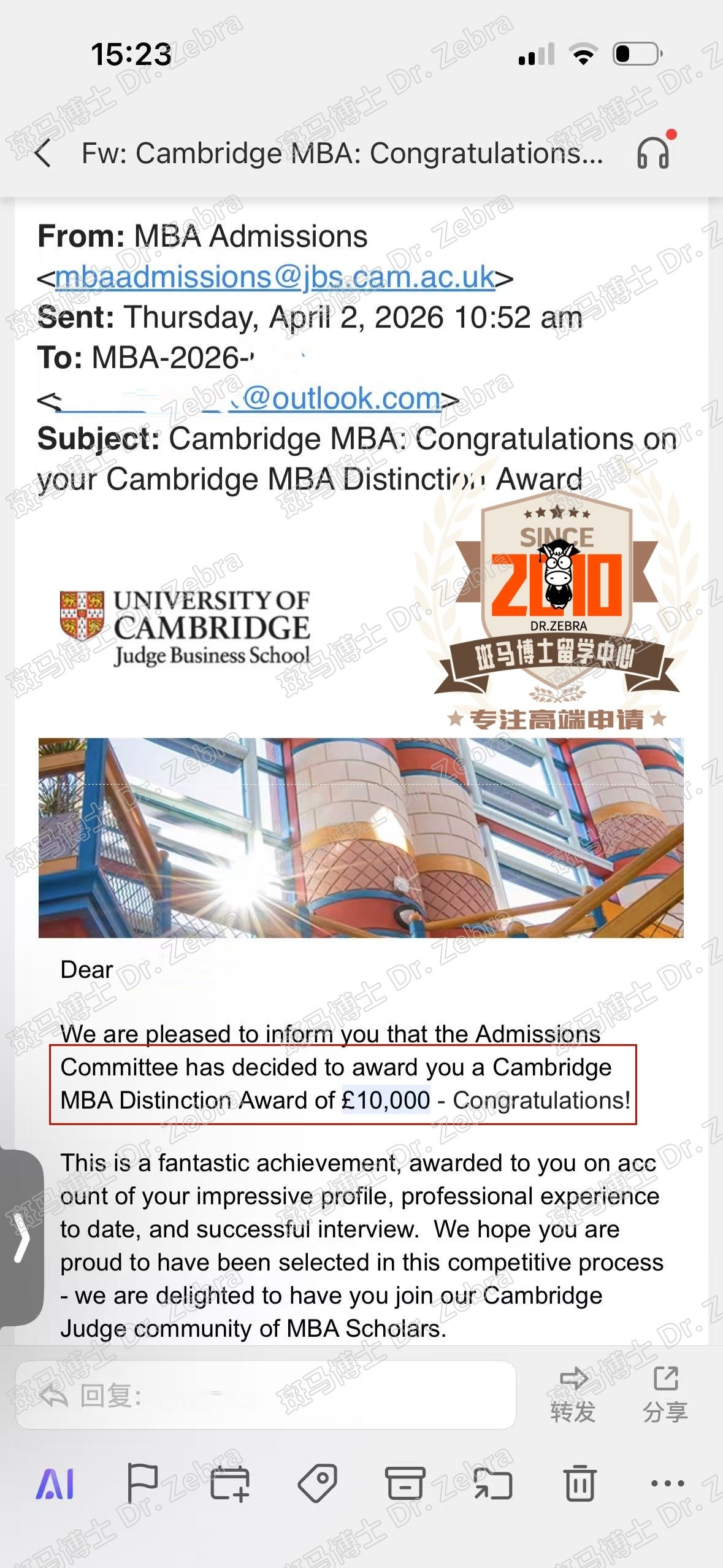 恭喜斑马博士客户获得University of Cambridge MBA硕士录取+10000英镑奖学金!