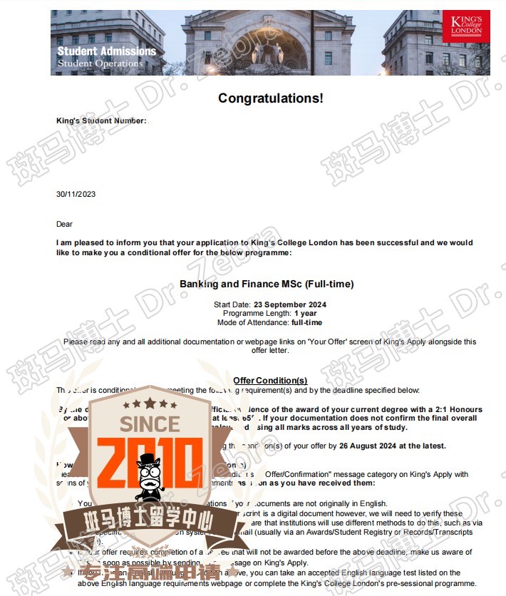 【斑马博士捷报】伦敦国王学院 King's College London(KCL)MSc Banking and Finance银行与金融硕士录取!