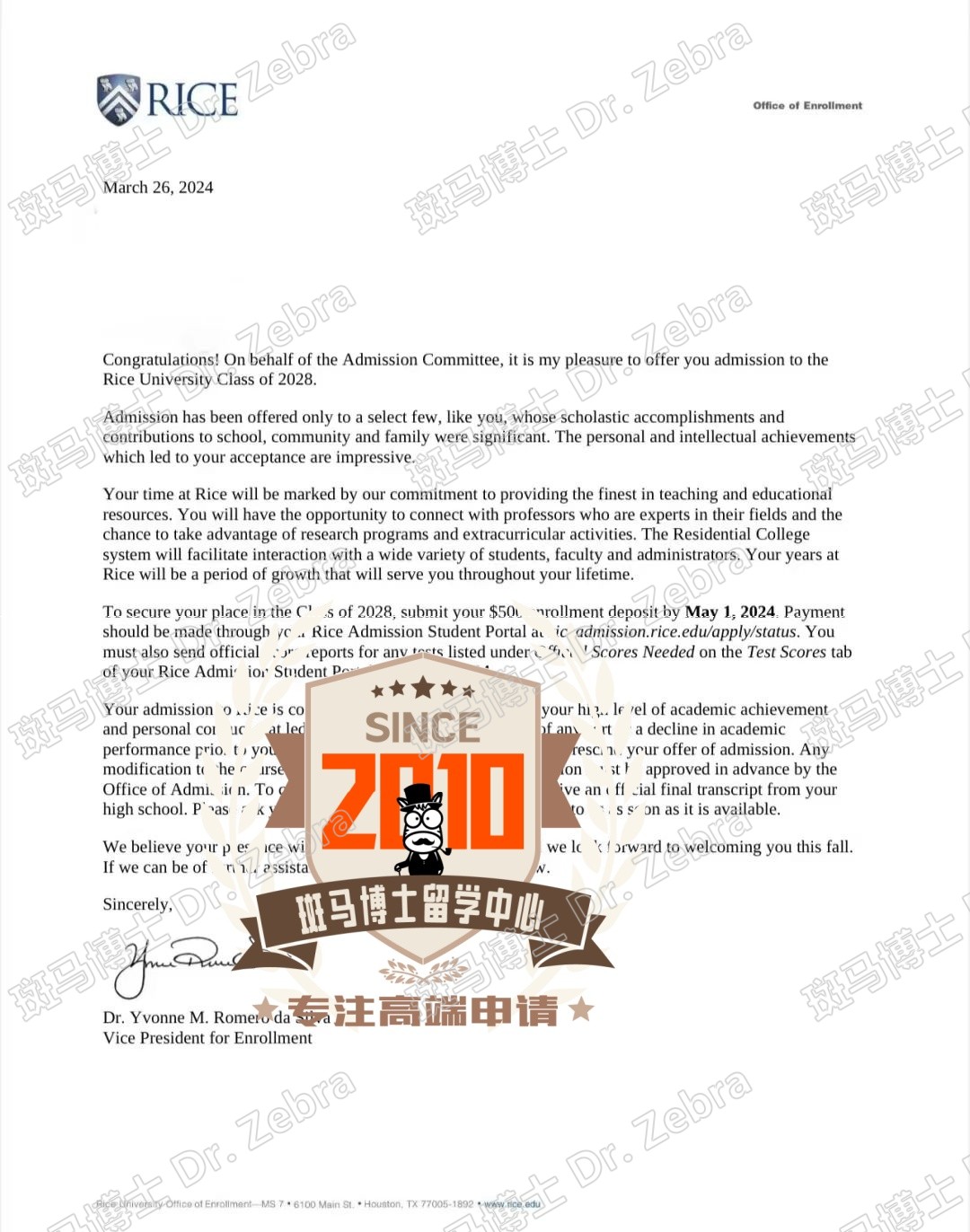 恭喜斑马博士客户获得莱斯大学Rice University本科录取!