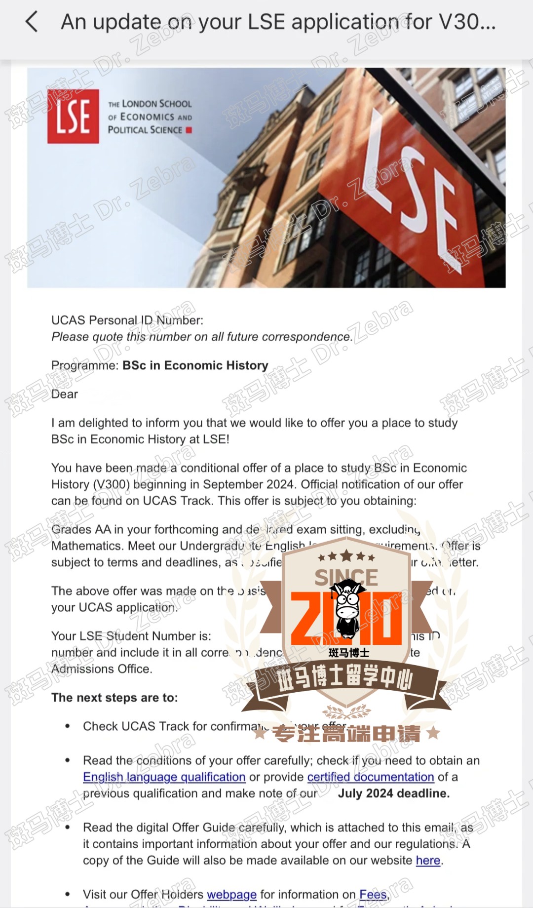 恭喜斑马博士小客户获得伦敦政治经济学院The London School of Economics and Political Science(LSE)BSc Economic History经济史本科录取!