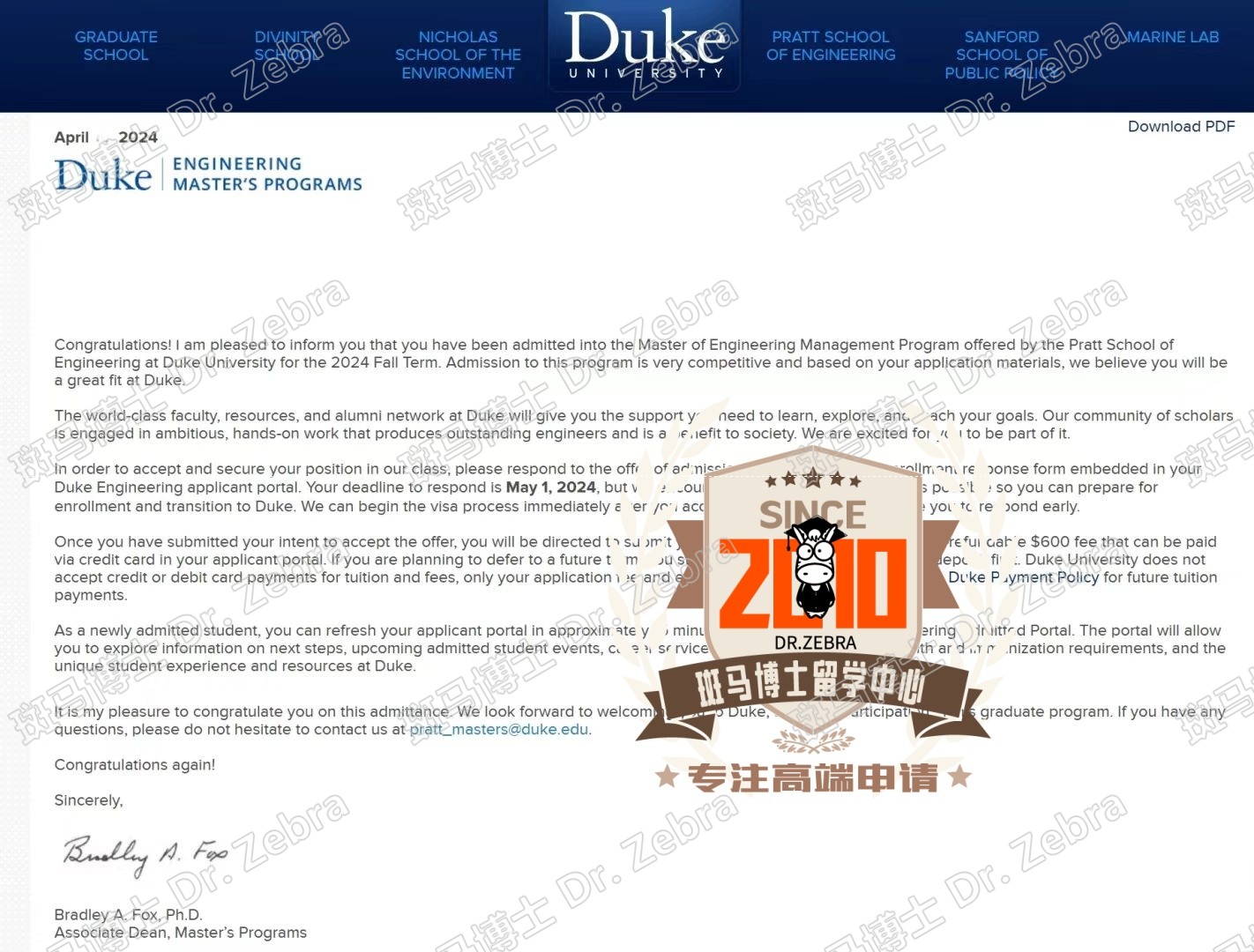 【斑马博士捷报】杜克大学Duke University Master of Engineering Management(MEM)工程管理硕士录取!