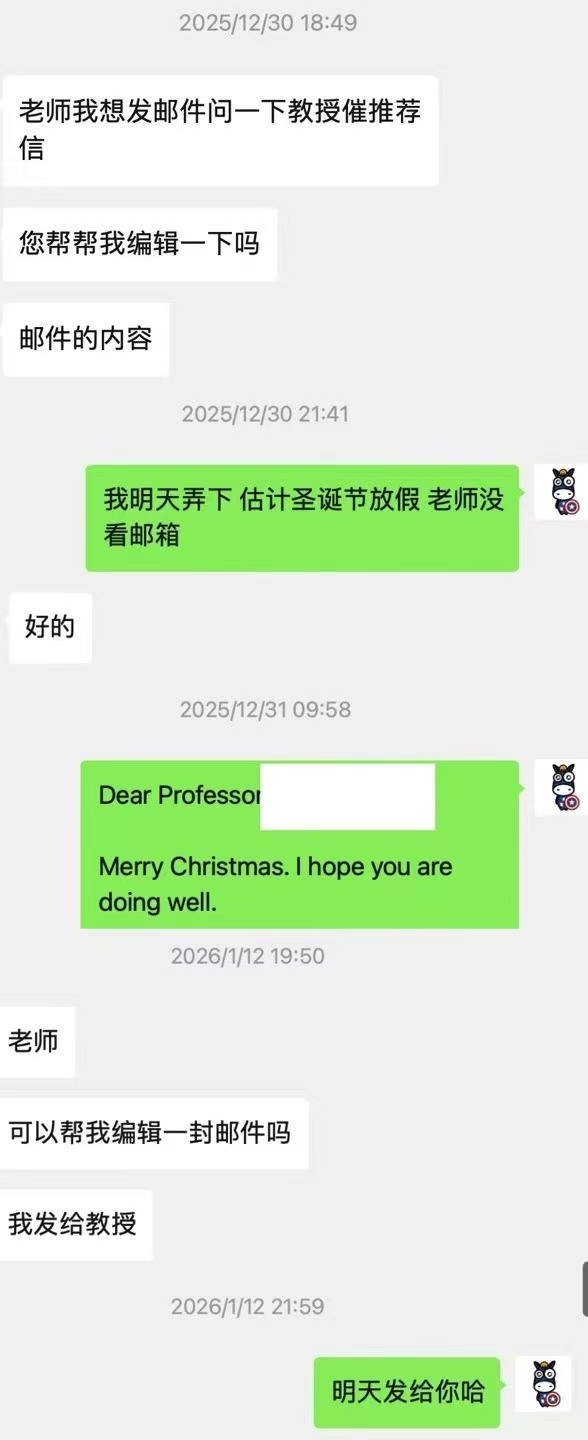 再说到负责程度:不管是申请老师,还是U叔本人,都是参与度极高,连向教授求推荐信的邮件,都是U叔帮学生起草了3次